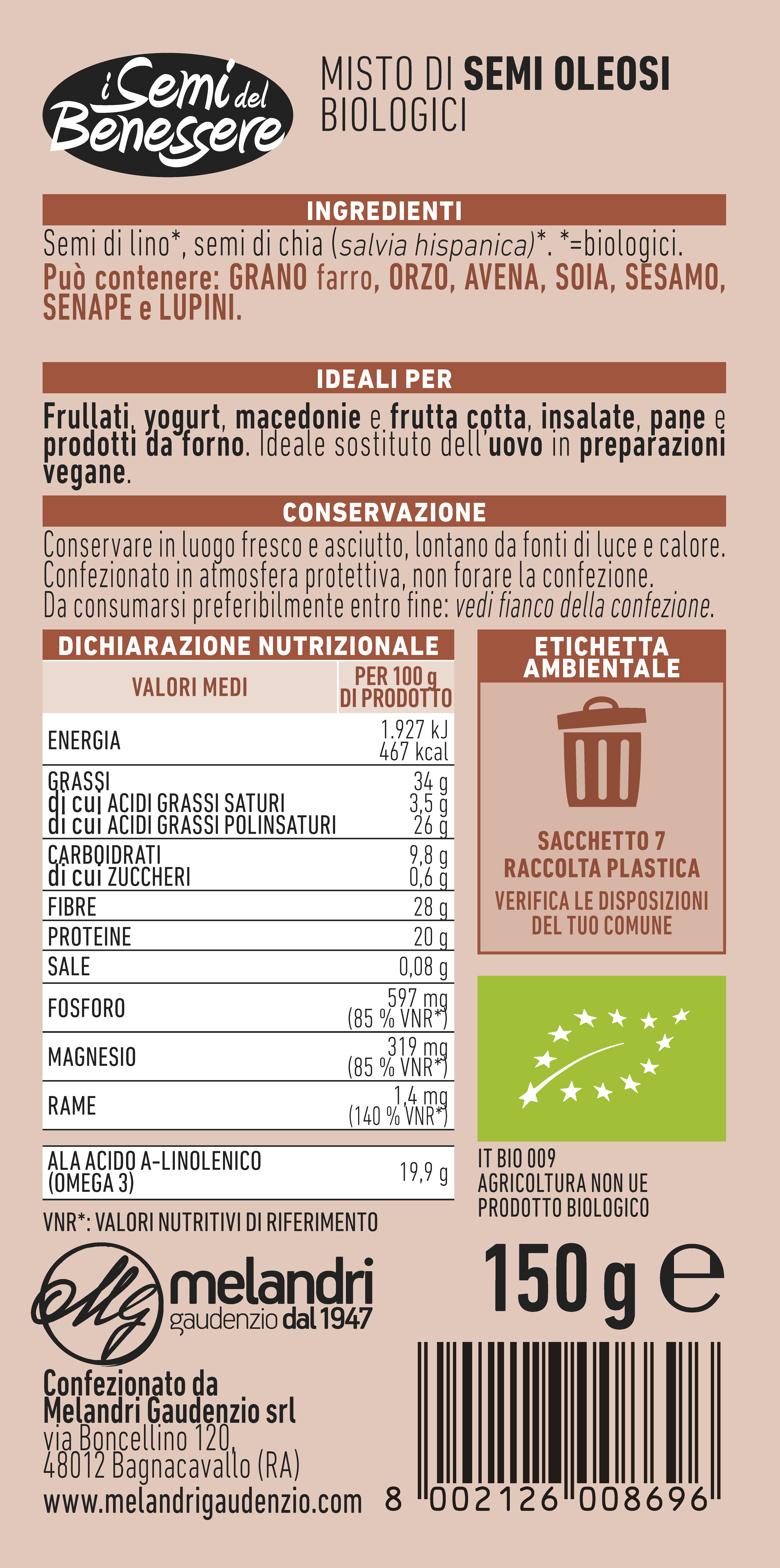 Ingredienti: semi oleosi in proporzione variabile (semi di lino* , semi di chia Salvia ispanica*).*=biologici
