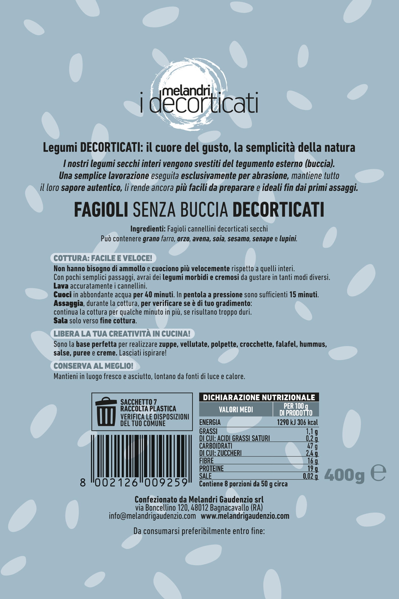 Il processo di decorticazione parte dai fagioli cannellini secchi interi che vengono svestiti del tegumento esterno (buccia) mediante una lavorazione eseguita esclusivamente per abrasione, mantenendo tutto il loro sapore autentico e le rende ancora più facili da preparare.